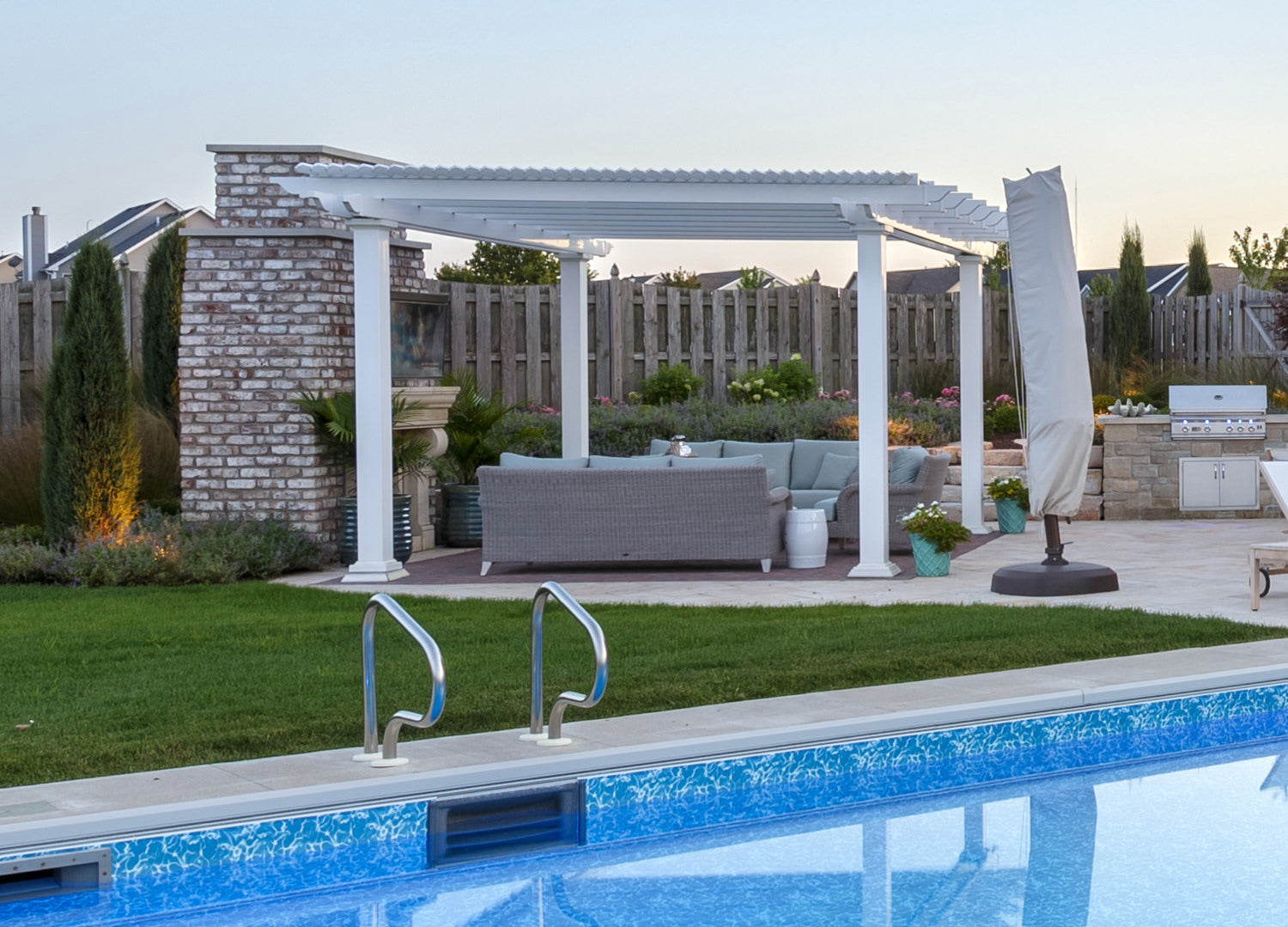 2. Low Maintenance - The exterior of every piece is made of premium extruded vinyl that is as beautiful as it is durable. Anyone who has ever had both a vinyl fence and a wooden fence knows how much easier it is to clean and maintain vinyl. Sunset Pergolas are virtually maintenance-free and are guaranteed to never chalk, pit, discolor or become brittle.